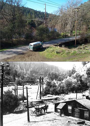 This one shows the site of the Blue Lakes power house. It is interesting to see that the power lines still run on the same basic routes as they did over 100 years ago. The building is long gone, but the foundation remains.