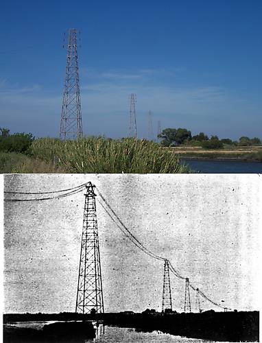 This shows the old San Joaquin river crossing of the Electra power line. When we tried to find the site of this crossing, we hardly expected the original towers to still be there, but there they were! These were erected in about 1900 (the old photo is from a 1901 issue of the Journal of Electricity). The top of the tower has been replaced, and the footings changed from redwood pilings to cement, but the main tower structure remains. Are there any older towers still standing anywhere in the world? |