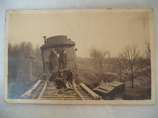 This accident was photographed on March 18th, 1919. This postcard was not mailed and I have no information on the location. There is one telephone pole to the left. It does not appear to have any crossarms, just one or two insulators mounted on the pole sides. By the look of the damaged trestle, the train service in the area was interrupted for a while. I have no recollection of when or where I acquired this postcard. |