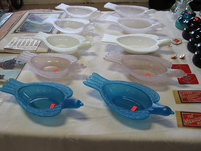 Lots of Hemingray bird dishes for sale at Columbia City, IN show 2009