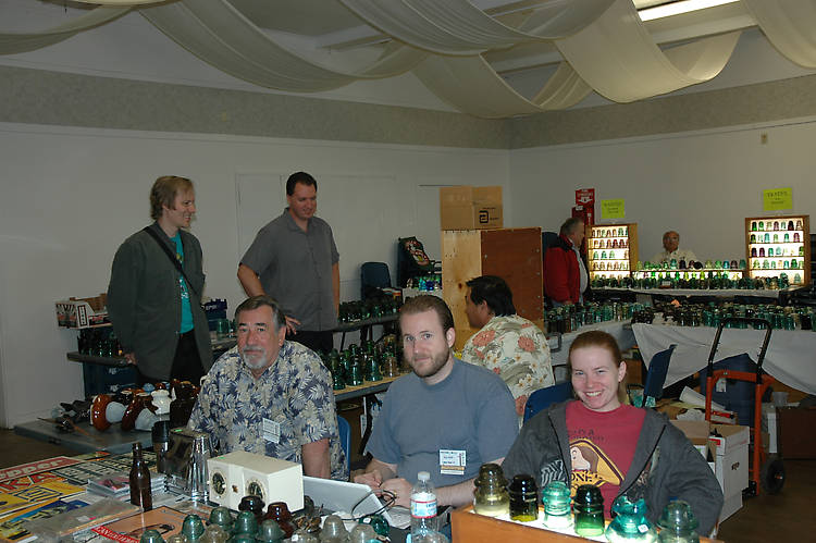 Smiles abound when you attend an insulator show. Seated in the foreground, left to right, is Bud Willis, his son and daughter-in-law, Christian and Maggi Willis. Standing is Paul Greaves and Rob Baumann as they chat with Colin Jung (seated). Far background is Frank Feher in red jacket and Glenn Adkins seated behind his table. We had a full house of dealers this year! |