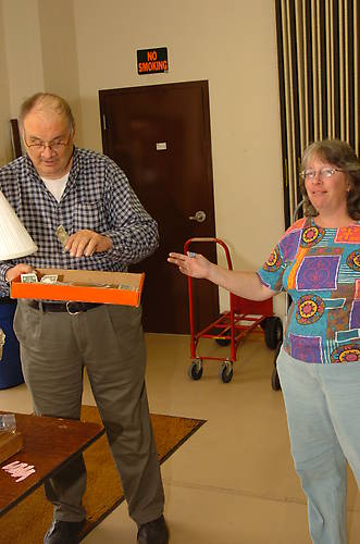 Chuck Dittmar draws for door prizes and the Bored Warmer Trophy. An interesting twist is added, in that you may contribute a $1.00 to have your name deleted from the draw for the trophy. It raises some nice money for prizes...you just have to have a trophy no one wants to take home...LOL |