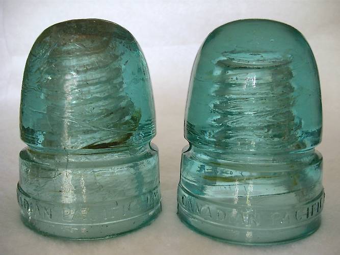 These two CD 143 Canadian Pacific pieces are the EIN [090]. That is, they are embossed: CANADIAN PACIFIC RY on a raised slug plate. These have a MLOD. Both of these pieces have obvious olive streaking, but they have lesser amounts of milky streaks too. Both were formerly in the collection of Ruth Kidder of Punta Gorda, FL |