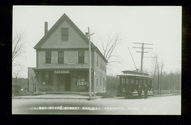 The trolley line seen ran as far east as Scituate, MA 8 miles away (by the shore) and so did the open-wire telephone line that pararelled this route (now known as MA State Route 123). A major toll circuit also went easterly from this location to Scituate (no photos available) pararelling this roadway less than a mile to the south. It was a major toll route between Southern Massachusetts Telephone Company's office in Rockland (a few miles back, westerly) and Scituate. This 10-mile line was a legend for some reason. It was removed in the 1930s and insulators found in the woods from it were CD 104s, many having "hasp" no-tie-wire galvanized clips used around the insulator in lieu of tie wire for attachment (I have one from this line). |