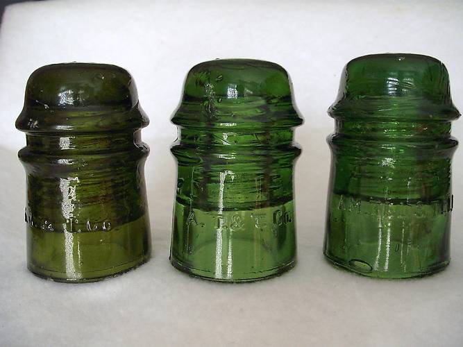 On the left is a nice olive green embossed: A.T. & T. Co. That is EIN [010]. It also has backwards 10 on the dome. The center toll is also a EIN [010] embosssed: A.T. & T. Co. The letter spacing is different from the one on the left. This one has a 00 with a glass dot on the dome. Nice green color. The toll on the right is embossed: AM. TEL & TEL .CO. This is a variation of the EIN [010] this one having capital letters for the CO. This toll has backward 11 on the dome. This one is a nice yellow green color. |