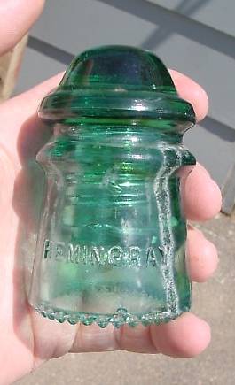 Justin Martin brought a box of nearly identical Hemingray No.9's to the Spokane show for me to look at. All had the same embossing and all had olive swirls. This one however, had some severe flashover burns that made it stand out from the rest. Not as visible as the burn to the right, another burn of similar size is on the left side. Two more burns are on the back. I have a number of ponies in my collection showing a burn, but nothing like this. Flashovers usually occurred from lightning strikes along the line. The current surge caused a flashover all up and down the line until dissipated to ground. Judging by all the others I have seen over the years, this piece must have been very close to the actual strike, yet just far enough away to not be broken from the thermal shock of the flashover. Interesting piece of telephone history. |