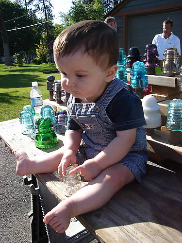 With a fresh collection to fill his sales table, new dealer / collector Kolba Simmons seems kind of bummed that sales were slow on Saturday morning, but that isn't enough to stop him from drooling over Bill Vincent's sales stock across the aisle.