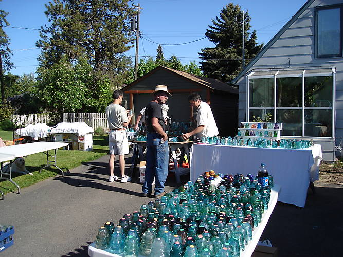 Paul Ziemer took the Bill Vincent Award for early arrival this year by confusing 0600 hrs with the scheduled 0800. By 0700, others were beginning to stir. L to R Shanti the Deathdog from Hell waits in stealthy immediacy for the first dropped sandwich as Don Hardesty checks out an aqua California toll. Mid Norris looks to confirm an exit strategy, as Bill Burger puts out fresh baked sales stock. |