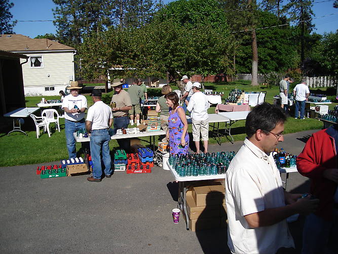 By 0800, many of the vendors were set up and ready for action. Jim Sinsley discusses the subtle differences in light and medium Septic Enchilada with BIll Vincent as Bob Jackson casts a dirty old man look at the DLI as she hobbles past on a bad hoof. The careful observer will note that Linda Banks and Marcia Hardesty have occupied the same spot of grass for the last eight photographs ..... did anyone ever see them move ? Meanwhile, up front, Bill Burger explains to Ron Yuhas' red jacket what causes shadows. |