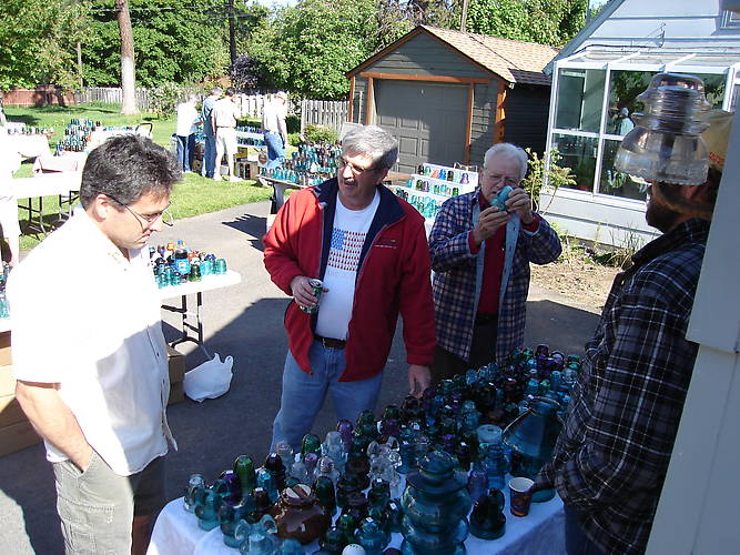 Bill Burger seems unsure about the half price sale being offered by Shifty Yuhas since it is Justin Martin's table. Bill Reid scrutinizes a light aqua BGM.