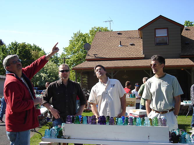 Ignoring the wart having grown through the sleeve on his right shoulder, Brad Dahlquist squares off with the cameraphist. Don Hardesty (at far right) uses the distraction to slip some of Shifty Yuhas' sales stock into his pockets as Shifty tries to explain that flying "thing" that had come around earlier. Bill Burger plays along. |