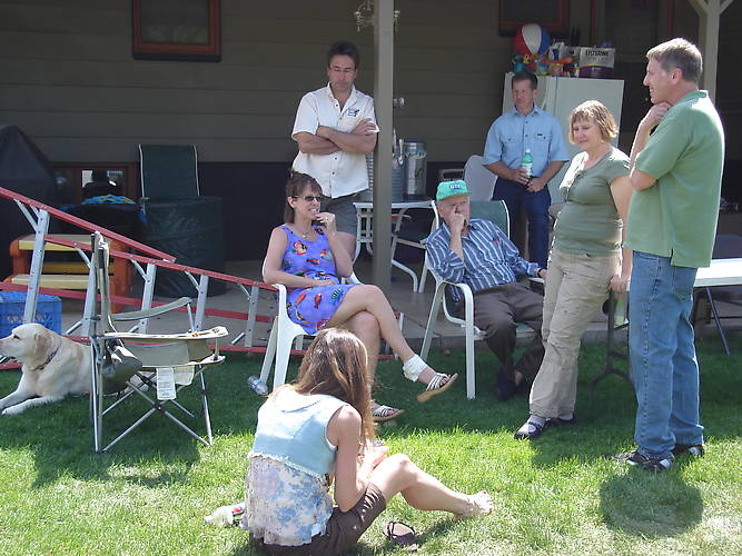After the police dispersed the crowd with tear gas, concussion grenades, and canine units, the few able to secure safer ground inside the compound reflect on another weekend pointlessly wasted. Most of the good help that makes Spudfest so much fun are pictured here. A big thanks to Widdo Bwudder Bill Burger for an assortment of tasks handled. His bride hides behind the camera here, but also did much to help, including take most of the photos shown. Dan Simmons lingers in the background after returning the tables across town - thanks Dan. Dan's gal Kelly sits with her back to the photographist. Sh also was much help with many of the details, and my own DLI rubs her chin and wonders why she puts up with it all ... a real good question, but thanks just the same, Sweetie! Bill Reid provided half the reason for even doing it. For over 30 years he has been my mentor and laughing companion for all things absurd in this hobby. Howard and Linda Banks were dazed from too many miles and too little sleep. We sure enjoyed their taking the time to join us. Oh yeah, ... and thanks to Shanti the Deathdog from Hell for seeing to it no dropped meat or cheese went unchallenged. See you all next year. |
