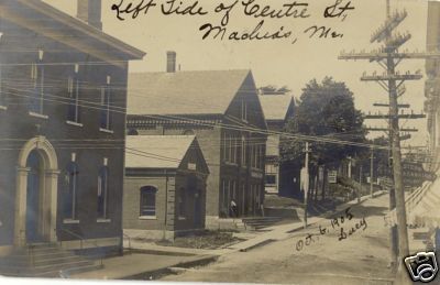 Seen on the right is a utility pole supporting many telephone lines as well as those for electric lighting service.