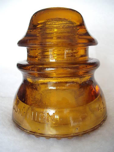 This one is embossed: DOMINION - 42 // P {in a diamond } / 10 This is EIN [020]. The color is a nice golden yellow amber. It is a touch too orange in the photo. This one has RDP. There is a considerable range of ambers to be found in the Dominion 42 set, from pale yellow to deep red amber. A very collectable set of insulators! |