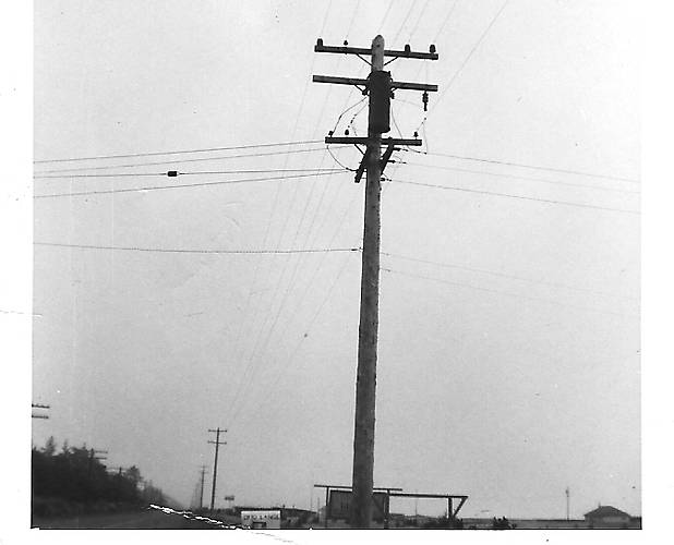 This pole picture was taken in the 1950's in Ocean Park, WA. Note the old style transformer for 7200 volts. it probably belonged to the previous utility in that area, West Coast Power Co.