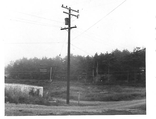 Another pole picture taken in the 1950's in Ocean Park, WA. Note the old type transformer for 7200 volts. it probably belonged to the previous utility in that area, West Coast Power Co. A two cross arm open wire telephone line is visible in the background. |