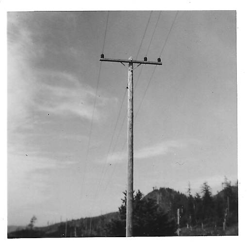 A Pacific Power & Light Co. pole photo taken in the 1950's near Cannon Beach, OR. Note the large size "Hi-Top" U-801 insulators and the un-insulated neutral wire spool typical of this company's Clatsop County installations.
