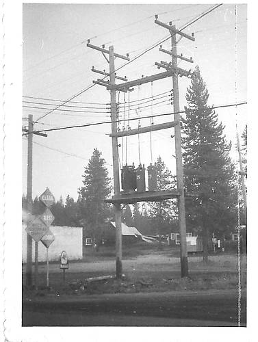 This picture was taken in the 1950's in an unknown location in Idaho. It is probably owned by the major power utility in that state, Idaho Power Co. The voltage is likely, 7200/12,500 and the higher voltage line on top is likely 24,000 volts from the size of the insulators used. |
