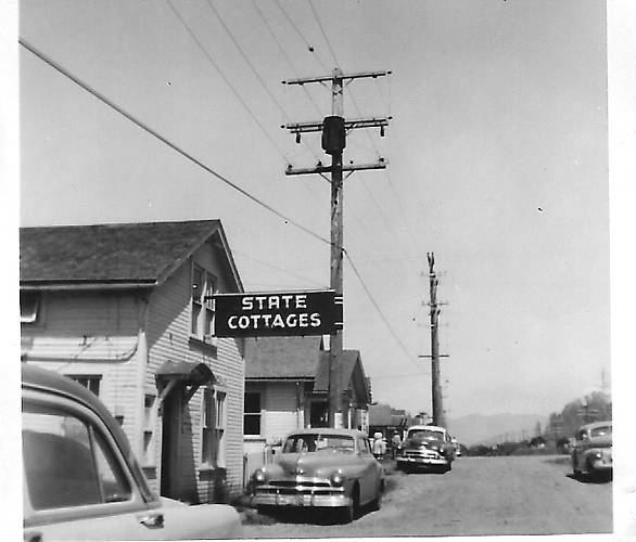 A photo of a Mountain States Power Co. pole taken in Rockaway Beach, OR. in the 1950's. The transformer is connected to 2300 volts and has external fins for better cooling by air. As I recall, you could rent a tacky little room at the State Cottages for about $10 a night! |