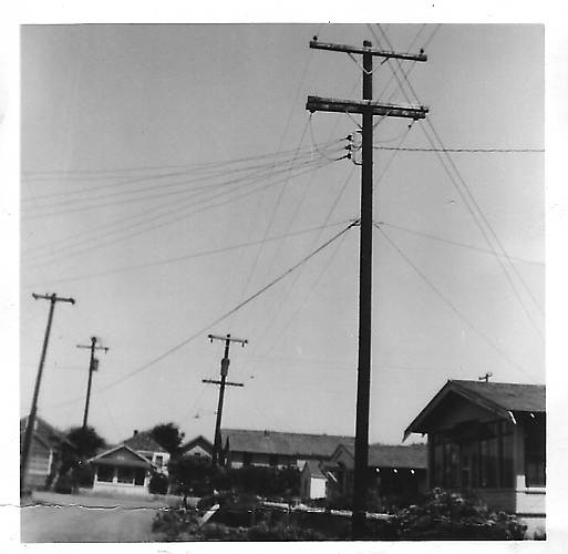 Some Mountain States Power Co. poles in Rockaway Beach, OR. taken in the 1950's. To the left are some poles of the Tillamook P.U.D. competing for service on the same street. The P.U.D. finally won!
