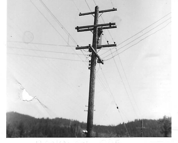 A Mountain States Power Co. pole taken in Rockaway Beach, OR. in the 1950's. This shows the back side of a 2300 volt transformer and the porcelain case "drop door" fuse cutouts used.