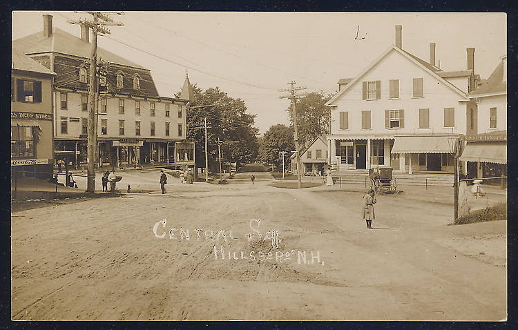 Criss-crossing the town center in this photo are a variety of electric light and telephone lines. I believe the taller pole in the center background with the small two-pin crossarm atop it held fire alarm circuit wires. At least here in the northeast it was somewhat customary a century ago to place such lines on the very top of utility poles. |
