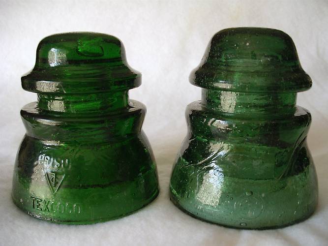 On the left is a CD 155 Embossed: CRISTOL / CT (logo) / TEXCOCO // 45 This style normally gets a big yawn from me, but these green Mexican beauties caught my eye! This one is a wonderful rich yellow green. On the right is a CD 155 RYT this is EIN [010]. It is embossed: RYT (logo) // 45. The color is a difficult to call tone of green. The dome has a little more yellow green to it. |