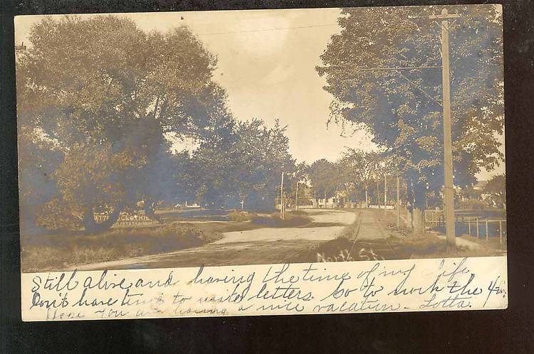 On the far right is a pole with a two-pin crossarm atop it which probably supplied current to the trolley line that ran alongside it.