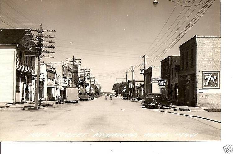 Reminescent of scenes decades earlier, on the left are poles with several twelve-pin crossarms upon them supporting open wire telephone service to this Minnesota community. On the right are electrical distribution lines and related equipment.