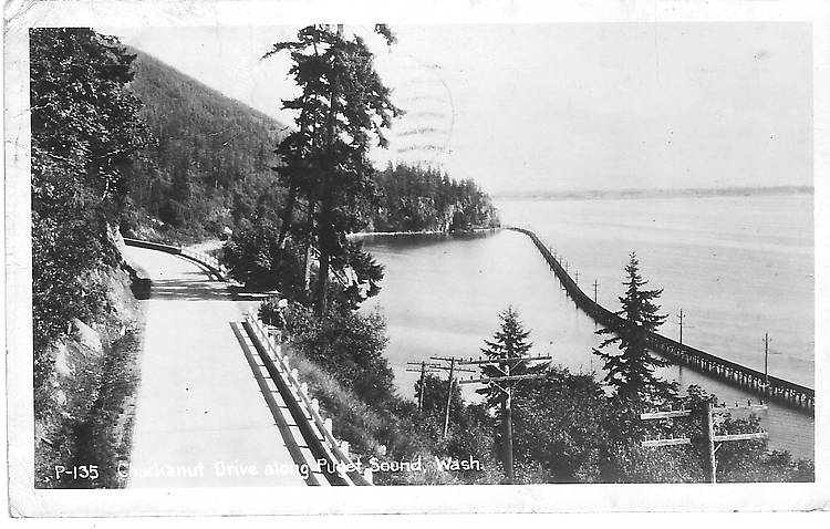 An old postcard of Chuckanut Drive, along Puget Sound, a few miles south of Bellingham, WA. Note the open wire telephone line and even more spectacular, the multipart power line on the interurban trolley line running "out to sea" on trestlework in the water. Today, this is still one of the more famous scenic drives in Washington state and a great alternative to the ho-hum freeway from Bellingham to Seattle. The tel. line is now gone and so is the Pacific N.W. Traction Co. trestlework line, however one can still see a few pilings left out in the Sound. The 55kV multipart power line is also gone although a few remnants still remain. This line also yielded some very rare Thomas M-3250 lily-shell multipart insulators in the 1990's to some lucky N.W. collectors! (you know who you are ;) ! |