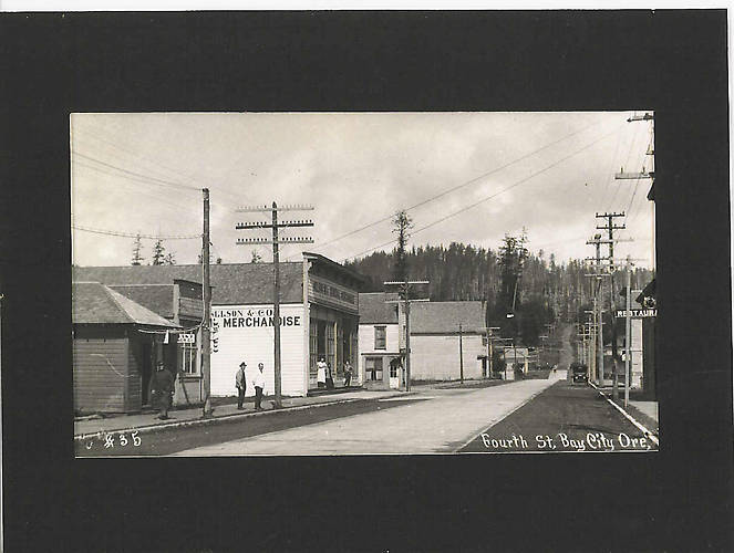 A view of 4th Street in Bay City, Oregon circa 1914. An open wire telephone line with three 16 pin crossarms is visible to the left. Note the middle crossarm is treated with some creosote like black preservative; which was common in this coastal area. This black crossarm becomes invisible on poles further up the street as it blends into the background. There is also an early use of lead sheath suspended cable coming down a pole and entering the Bell telephone exchange building. Next to the Bell building is the office of the Coast Power Co. Their power lines are visible on the right side of the street. To see an earlier shot of this street before they had that new strip of pavement, click NEXT..............Photo courtesy Tillamook County Library. |