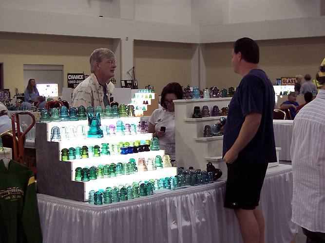 Jim White and Robert & Christine Baumann in conversation near their sales tables.