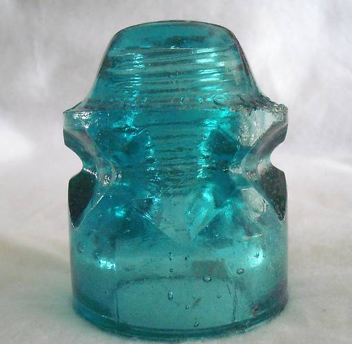 This is a CD 135 Chicago with EIN [020]. Embossed up on the shoulder: CHI. INS. CO. / PAT.OCT. 16. 1883. PG shows no period after 1883, this one has the period. This is in the normal color range for these: blue -aqua. The best condition one I've owned. One of those 'Must Have' CDs! Not too expensive for newer collectors either. |