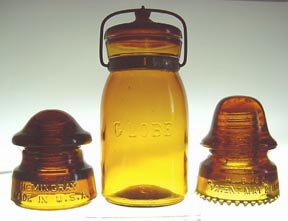 May is Birthday month for a couple of the kids in the HEMINGRAY family. Pictured on the right, is a H.G.CO. CD 162 [070] with sharp drip points that carries the May 2, 1893 patent date. His cousin GLOBE in the middle, also celebrates a May birthday by sporting a lid that is dated May 25, 1886. Another younger cousin, HEMINGRAY CD 168 [110] stopped by to wish his older cousins a happy birthday. All three are Orange Amber in color. Does anyone care for more cake or ice cream? |