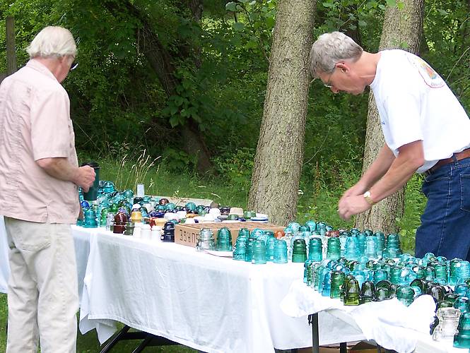 Our "Big gun" at the swap meet was the "Short guy" from Lima, N.Y. ! (LOL) ----- Everyone looks forward to seeing Ken Willick and his sales stock. He's very active in this hobby with digging, insulator shows, bottle shows and persuing leads on collections/pieces for sale. This makes for constantly changing show stock. |