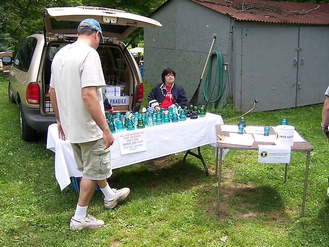 Sharon Foster watches over her and Johnny Hovanecs' sales table as club member Mark Zamboni moves in for the deals !