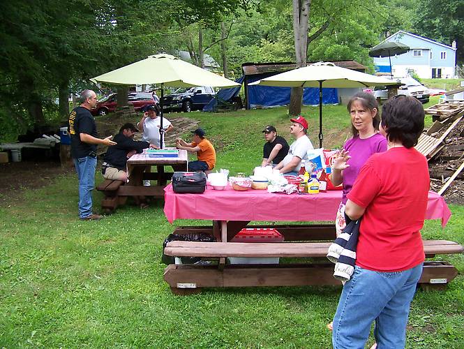 Show host Mike Donnelly (far left) has Tim Grantz (red hat) full attention. If I know Mike I'm sure "Ya know what... I don't care... Ta hell with 'em !" came up somewhere in this conversation. (LOL) ---- B.T.W.- Mike makes the picnic tables on wheels in picture. |