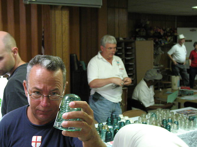 This insulator is from Jim Frstieri's table is it Green or Aqua HUM!!! Notice or host for the day Jeff in White CBIC shirt with glasses down to tip of his nose looking over the crowd and also notive all the way to the right in the photo the gentleman with his hands on his hips. That is John Hunsaker who does an outstanding job working the 50/50 raffel for the club. |