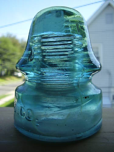 This is a sleeper that I had packed away probably 3 or 4 years ago. Pulling it out of the box last month, I was amazed to see that the glass below the wire groove is completely opaque and is almost a milky-jade color. It is difficult to photograph well, but the area below the wire-groove on this insulator is 100% full of milk and it even has little milky "fingers" that reach up into the dome. There are a few amber stringers to boot!! Thanks for looking! |