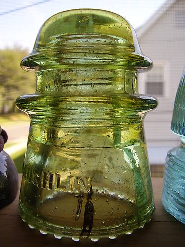 This citrine toll has to be the darkest citrine CD 122's I've seen. I was lucky enough to acquire this from a very old ICON listing (it was more than two years old at the time) in 2004 and was so happy when the seller replied and said that he still had it! It does pay to search through old, outdated listings. Anyways, this insulator is practically mint and knowing McLaughlin's usually crystal clear glass I was very surprised to see this insulator. It has an amazing 1/4" shallow carbon filled bubble right above the base!! I am glad that McLaughlin's quality control people let this one pass by. |