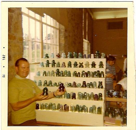 First National Picture, Collector who sold the Frank Miller Commemoratives. The insulator show commemoratives we see each year at the Nationals..He was pushing for me to buy some of them and I remember him stating the yellow ones were rare. Can anyone let me know who this collector was. I remember he had the "B" CD 196's on his sales rack, as shown. Here he is displaying some Canadian purples in his hands and wide groove Brookfield.. I might think the guy behind the display in the back ground looks familiar too and Dennis Donovan in the far back. |