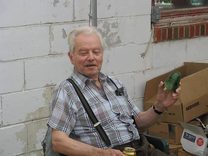 Bill Reid caught "sleeping" with an insulator in one hand and a beer in the other. Does it get any better than that? Bill recently turned 80 and had a great party at the Burger doings in May. At 80 still traveling to shows with friends trading insulators, telling storys, and having a blast. Not a bad goal to have. |