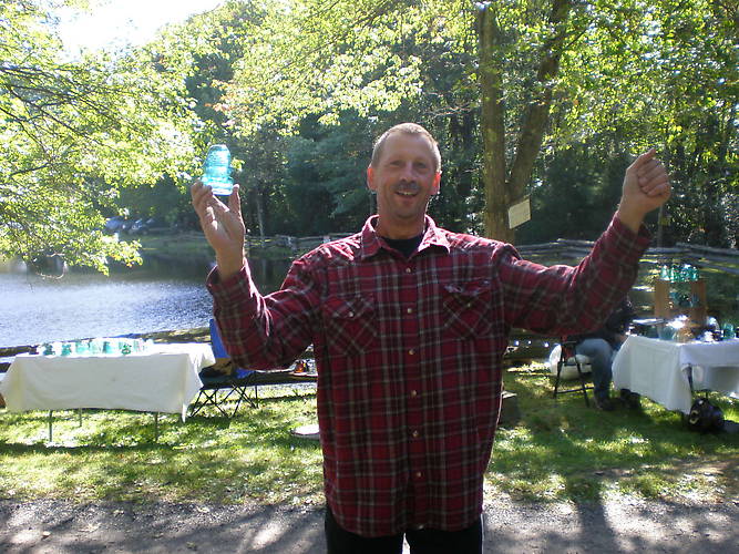 Mr. Excitement, Jimmy Simpson, holds a Pettingell Andrews that he just purchased at my table. Nobody has a better time at an insulator event then Jimmy!
