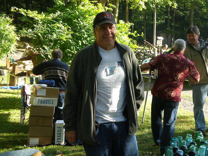 A very sly smile on the face of Dan May. Danny is a fixture at the outings and always seems to bring along interesting items. Over Dan`s right shoulder is Bill Meier. To his left is Dario Dimare shaking hands with Dave Justice. Way back there is James Bancroft. |