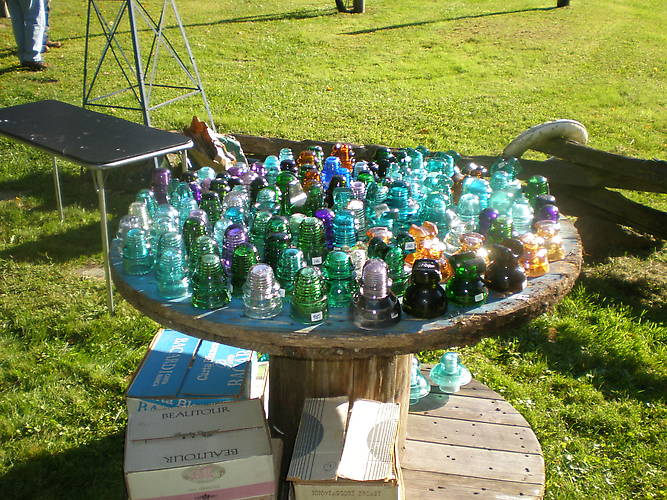 The cable spool has always been the standard display table at the Pole Cat outings at Golden Pond. The spools are aging and some being taken out of service. Many of us now bring our own tables just to be sure we have a place to set up. Peter Abbott`s spool of insulators was typical of the vast assortment of insulators available for sale or trade. |