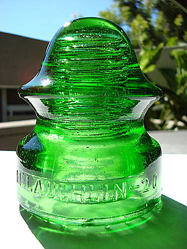 With all of the recent chatter attempting to define the color "7-up" green as it relates to McLaughlin's, I thought I'd post this bad boy. Far brighter and lighter than most. A beautiful insulator on a beautiful day too!