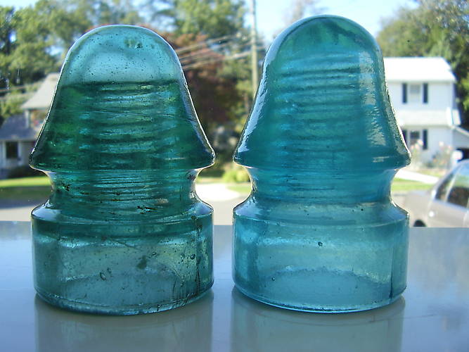 This is the greatest pair of pennycuicks I have ever added to my collection at one time. The jade aqua piece is not mint but displays very well and is the tallest CD 134 I own. The other insulator is an anomaly. What looked like a circular frost crack in the dome turned out to be a huge empty cavity – To top it all off, the pennycuick teat is about 1/3" off center! |