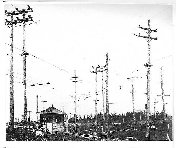This old (poor quality) photo is a rare shot of a rail crossing of the 2 major electric powered interurban railways that operated in Oregon, (1908-1933). Taken at Greton, near Tigard, OR., the Oregon Electric Railway is shown coming from the upper right to the lower left, and crossing the Southern Pacific Lines "Red Electric" rail line, coming from the lower right to the upper left. Notice the crossing of each railway's overhead power supply wires and the series of fixtures to separate the 1200 volt DC trolley wire of the O.E. from the 1500 volt DC line of the S.P., they had to be insulated from each other! What really caught my attention are the "wire guards" mounted on each railway's high voltage poles. The steel frame "catchers" are attached to the poles below the wires and have their own insulators. Barely visible are attachments mounted on each wire to 'grab' the frame in case they break! The O.E. is using 60,000 volts AC and the S.P. line is 13,200, volts. AC. Some nice multipart insulators ( long gone, ) are M-4325 on the O.E. and M-2340 on the Red Electric. This crossing was removed by 1950 and the S.P. line still remains in diesel freight and commuter service. |