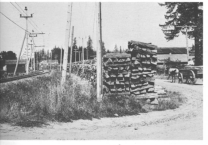 A photo of the Oregon Electric Railway right of way in Tualatin, OR. (too-wala-tin), ca. 1920. The 60,000 volt power line with M-4325 multiparts, followed the track and powered the many substations along the line to provide DC power for the trains. Notice the large amount wood stacked along the line waiting for shipment. This was the primary source of fuel in those days and was plentiful in Oregon! The local telephone line is seen on the east side of the road with glass insulators on a ten pin crossarm. |