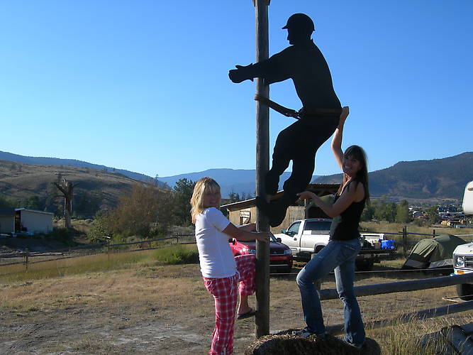 "Larry the Lineman" never had it so good. Here the "Insulator Gurls" meet Larry the Lineman and Kim is giving him a "hand". Maybe that is what Kim was practicing for in the earlier picture, and perhaps she was simply adjusting his safety belt. Naaahhh, I don't think so. Seems Larry was a very popular guy as will be seen in later pictures. |